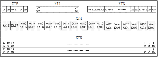 XT2为6针单排端子,由左至右依次,0V、K18为继电器KA18的单独回路,0V、K17为继电器KA17的单独回路,0V和XT1的A01相连,并作为KA01到KA16这16只继电器的公共端,E24和XT1的A24、B24、A25、B25相连;
